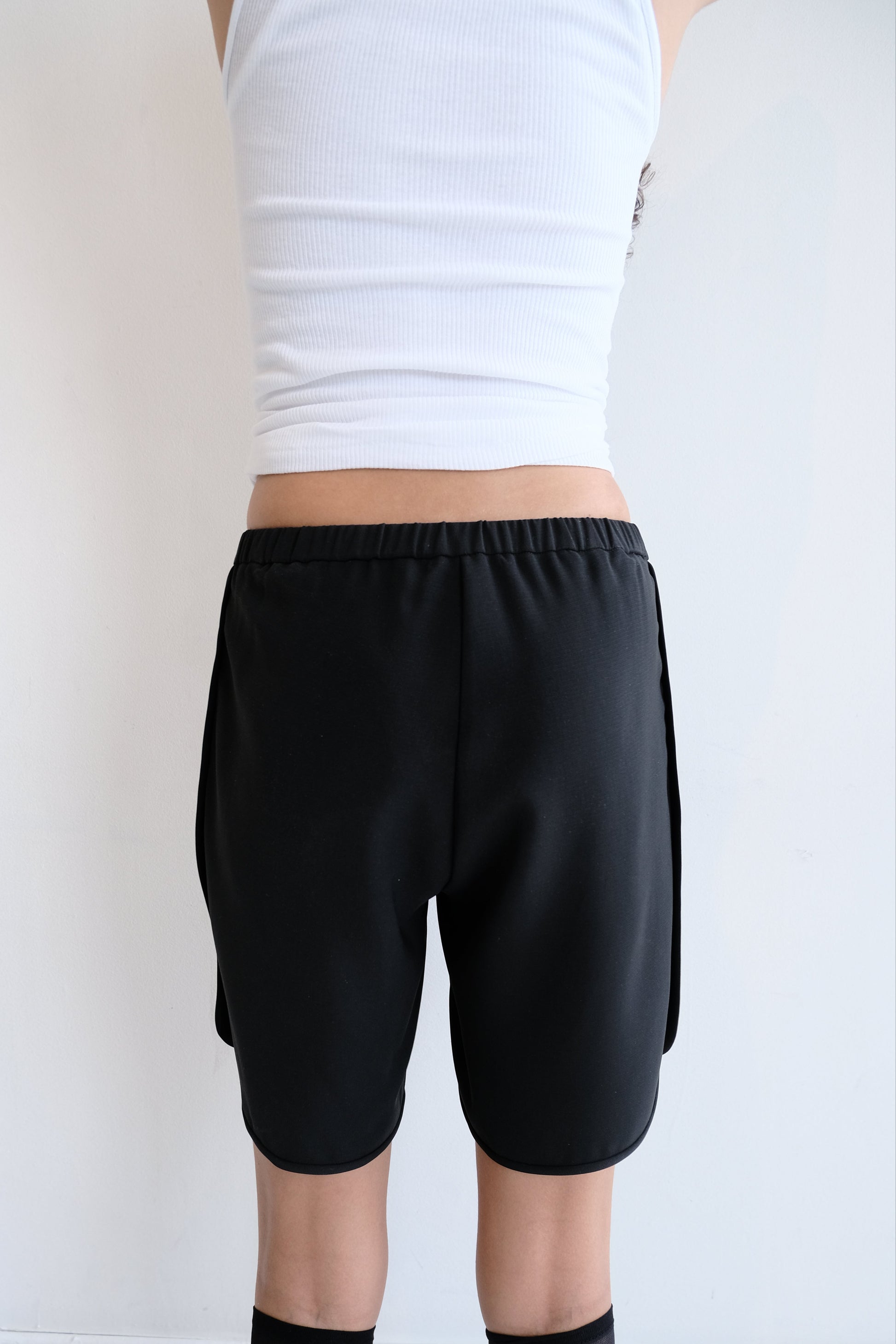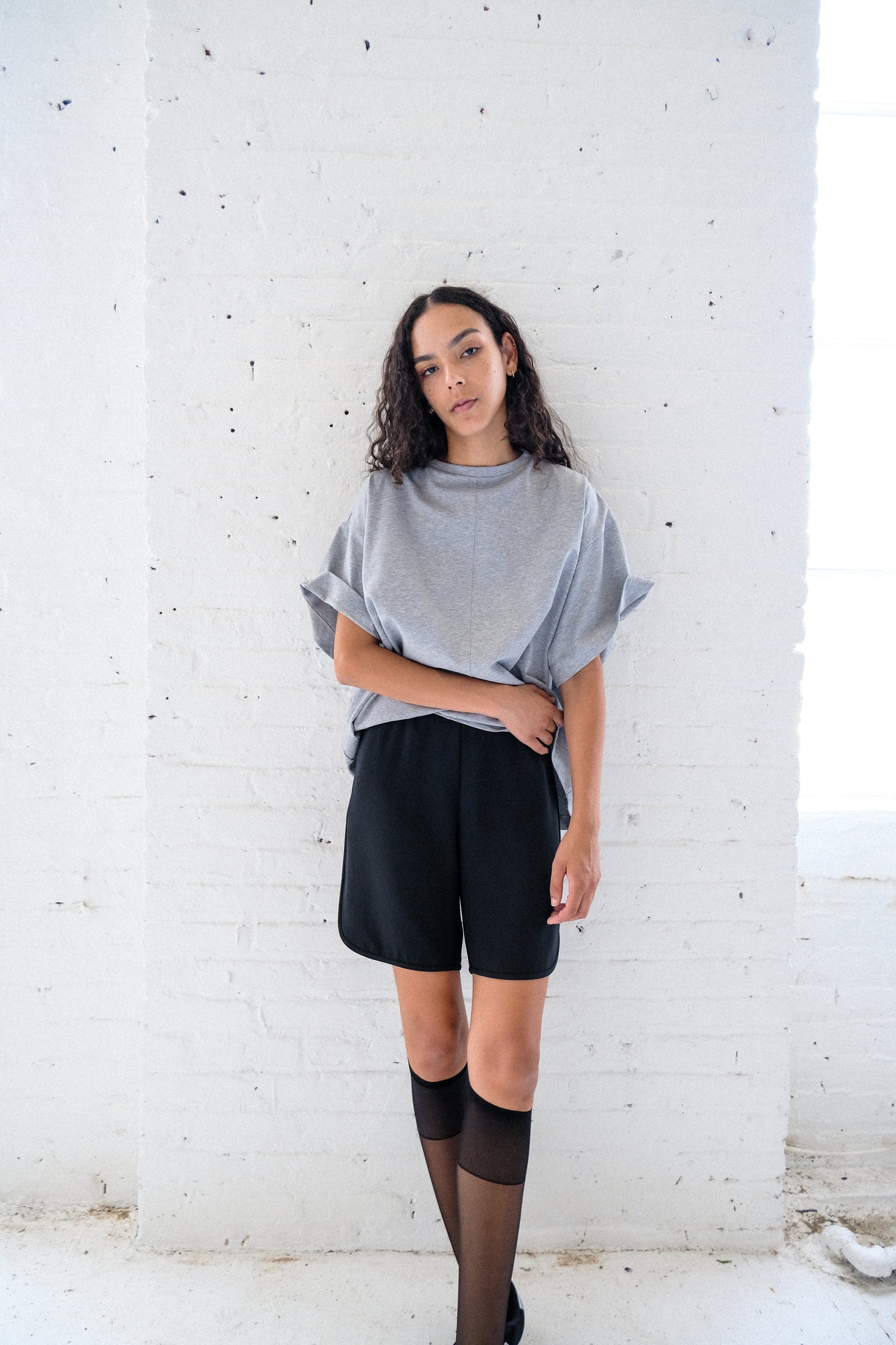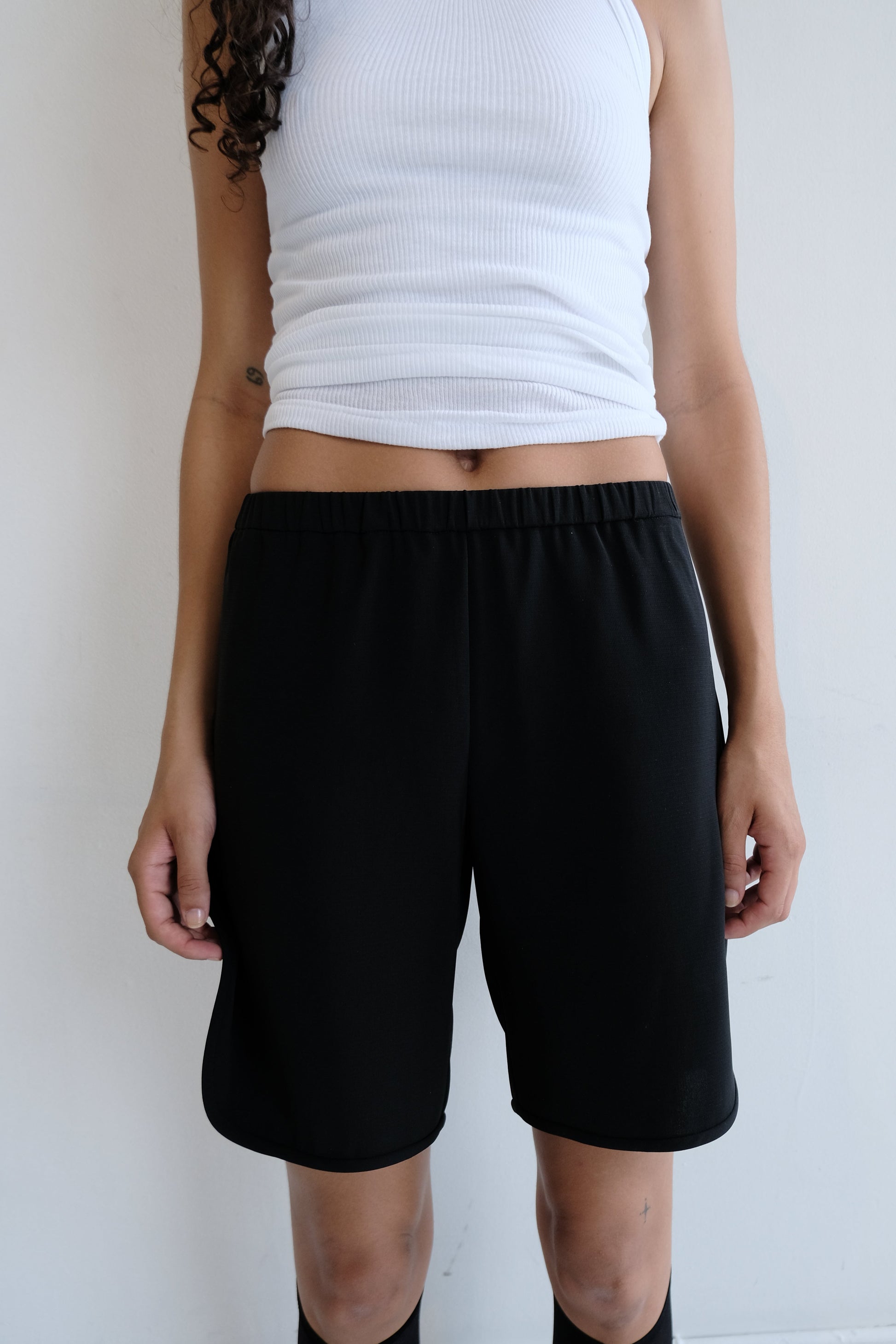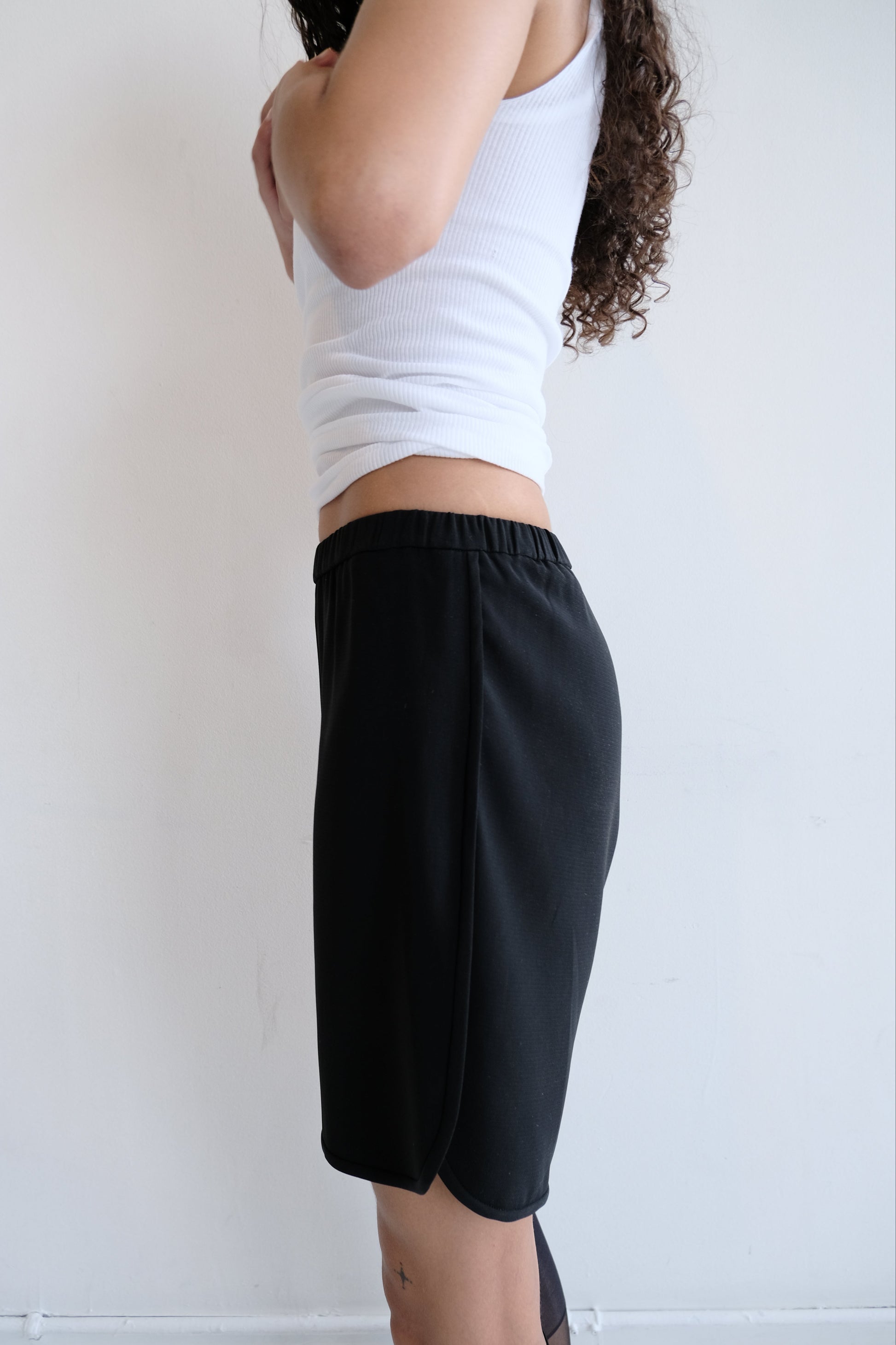 The vintage inspired Charli Short is available in black, and made of a mid weight crepe, with a beautiful drape. Self bound edge at side slits and hem, loose fitting overall and hits just above knee. Intended to wear on the low waist for a more oversized looser fit.