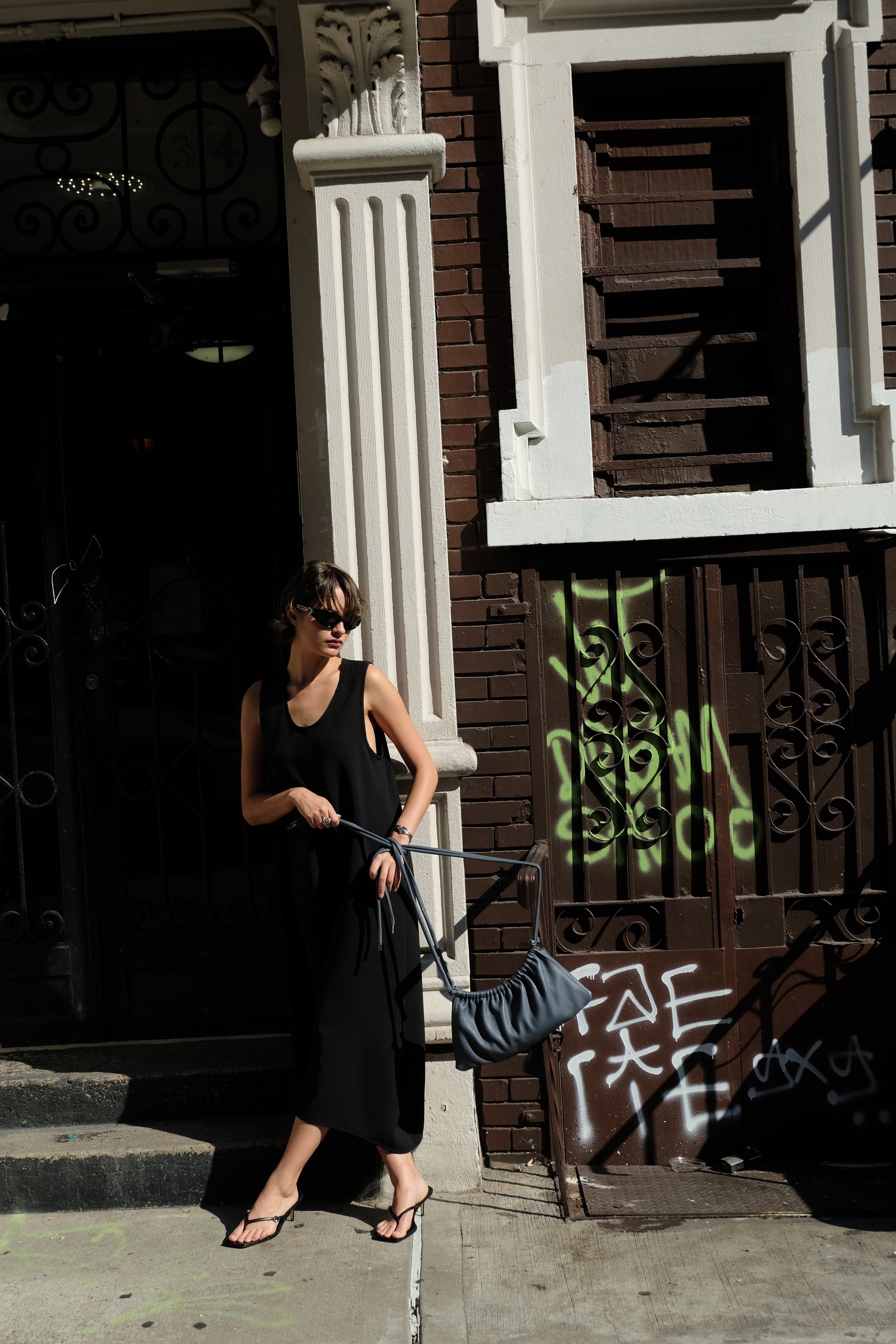 The Emmy Dress is made of a mid weight crepe, with beautiful drape and movement. Looser fit throughout, with a lower scoop neckline and armholes. Self bound seams and hem. Curved hem that hits at mid calf on most. Fits true to size/ slightly loose.