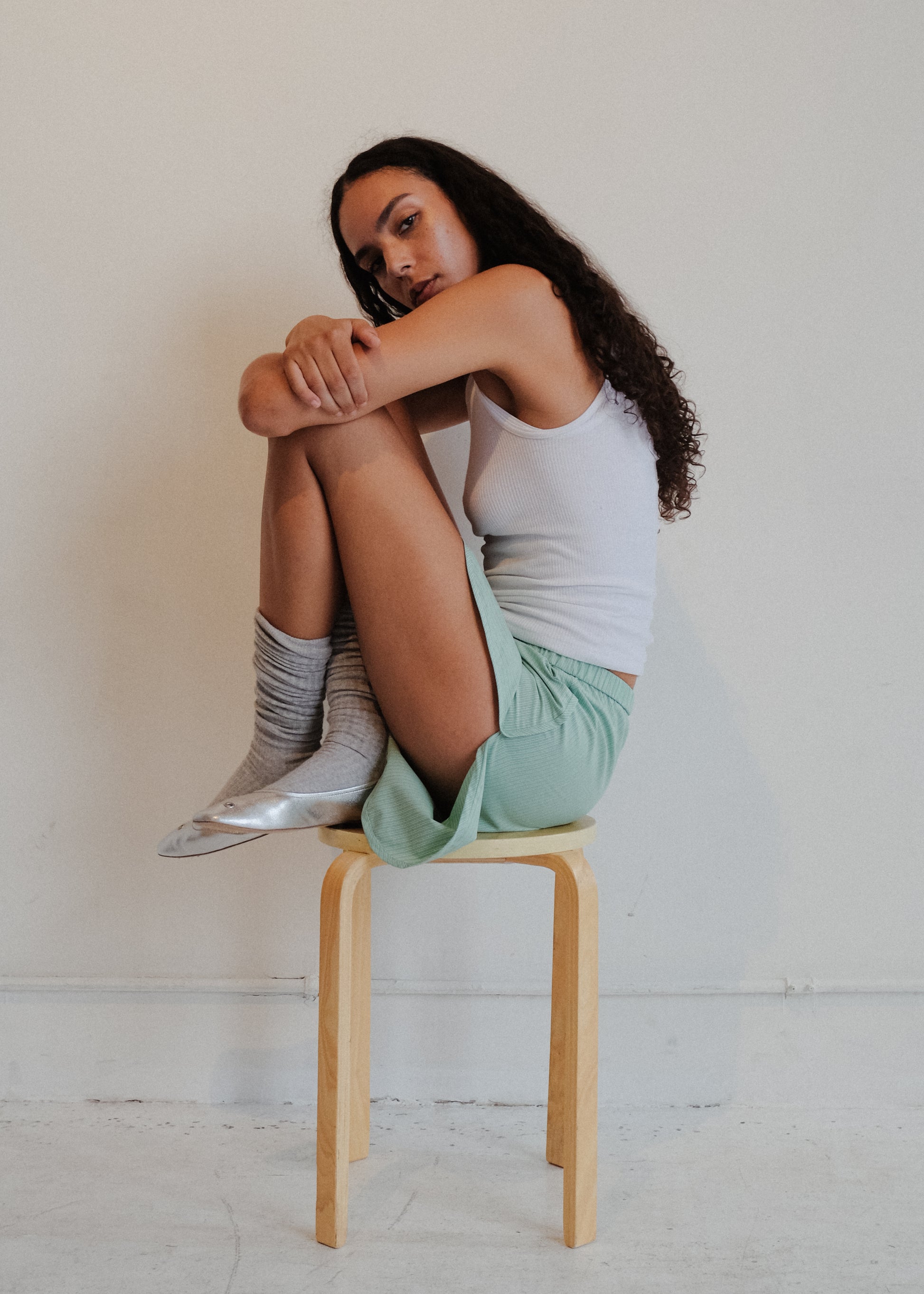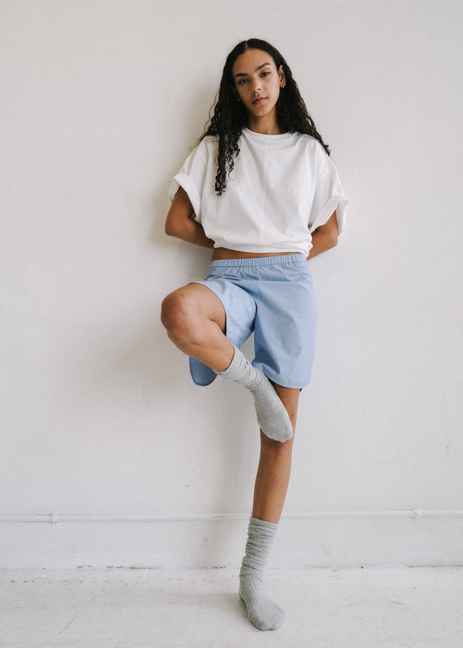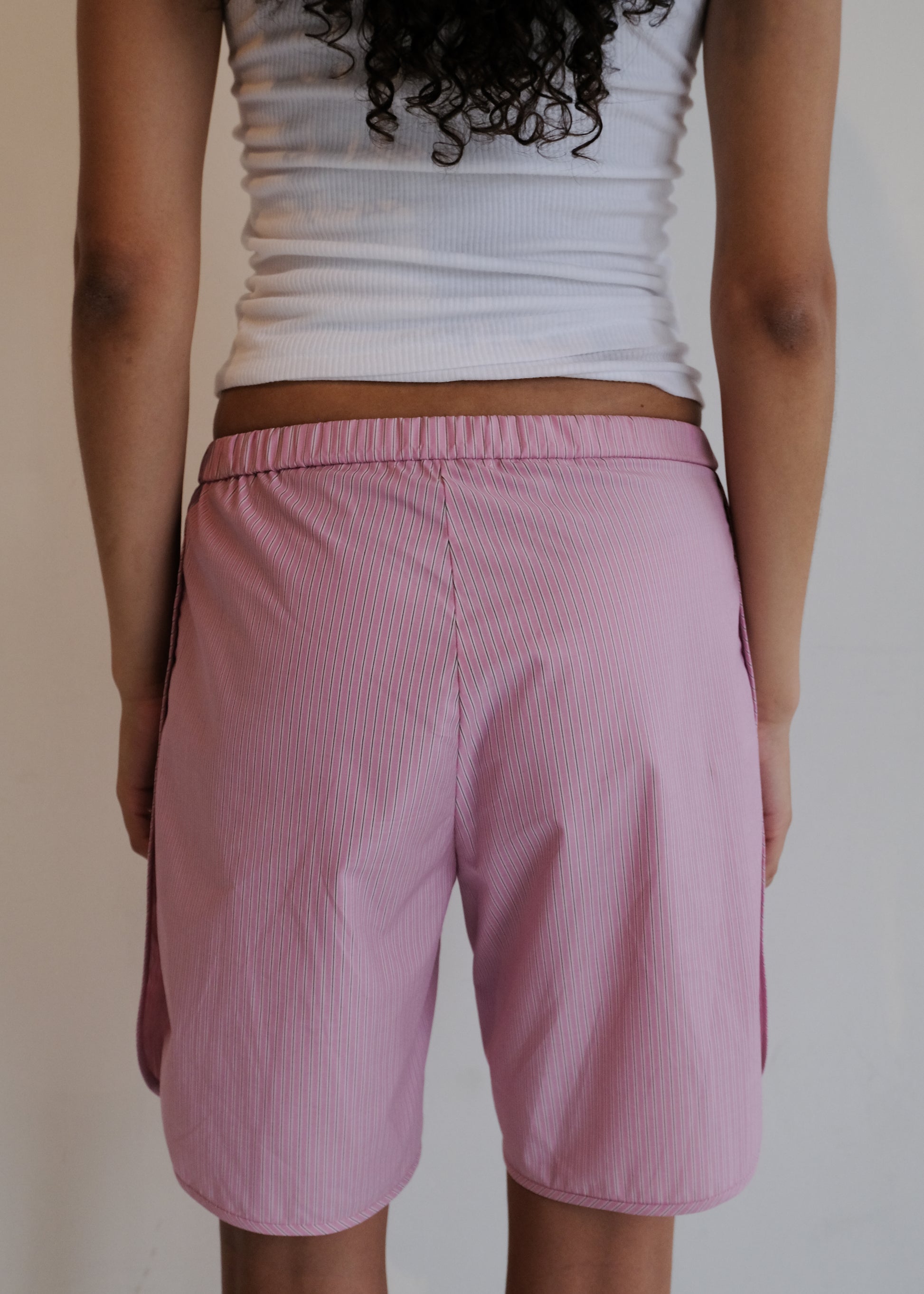 The vintage inspired Charli Striped Shorts are available in pink, blue, green. Made of a cotton and polyester blend, with a contrast white and darker stripe throughout. Self bound edge at side slits and hem, loose fitting overall and hits just above knee. Intended to wear on the low waist for a more oversized looser fit.